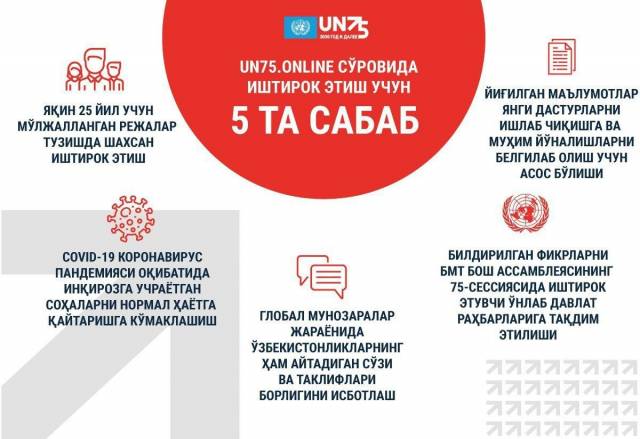 Shu kunlarda BMT tomonidan dunyo bo‘ylab global so‘rov o‘tkazilmoqda. Unda o‘zbekistonliklar ham faol ishtirok etib, o‘zlari istagan kelajakni qurish bo‘yicha fikr va takliflarni bildirilmoqda.