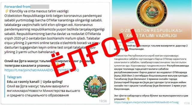 Ijtimoiy tarmoqlarda respublikamizdagi barcha oliy ta’lim muassasalarida o‘qish 2020 yilning 2 sentyabridan boshlanishi to‘g‘risidagi asossiz xabarlar tarqalmoqda.