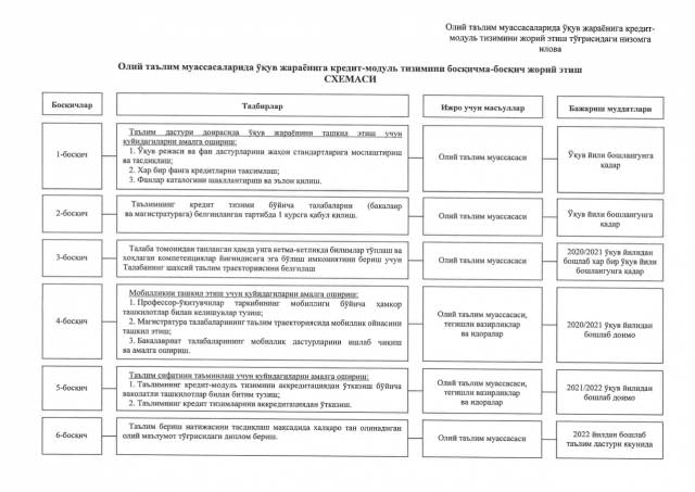 Shuningdek, qaror bilan OTMlarda o‘quv jarayoniga kredit-modul tizimini joriy etish tartibi to‘g‘risida nizom tasdiqlandi hamda quyidagi sxema asosida bosqichma-bosqich joriy etilishi belgilandi.